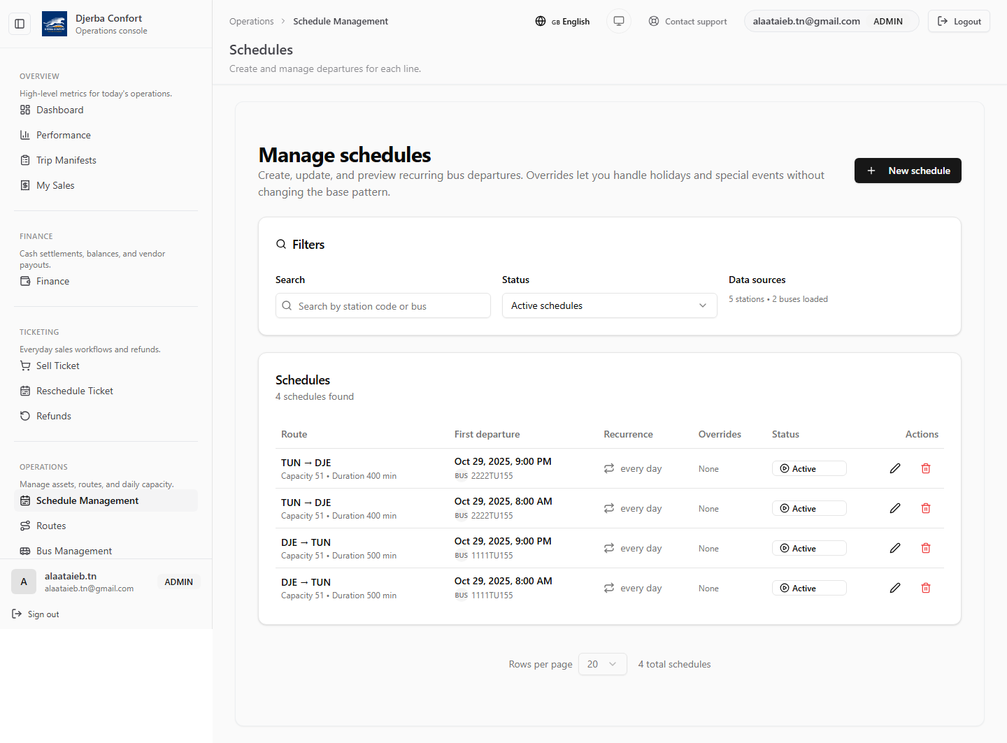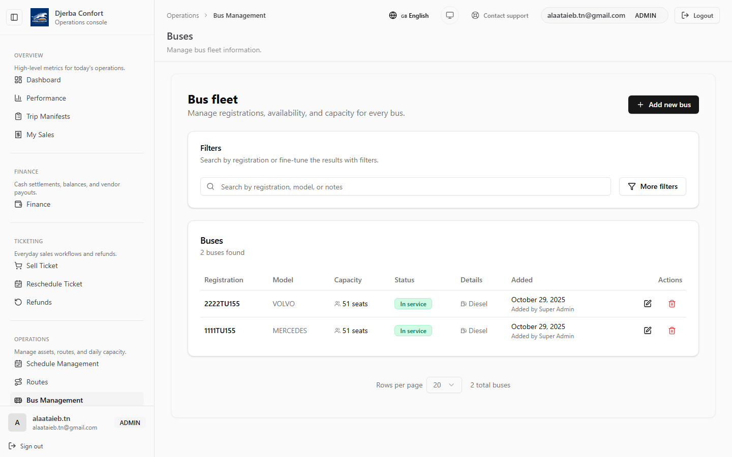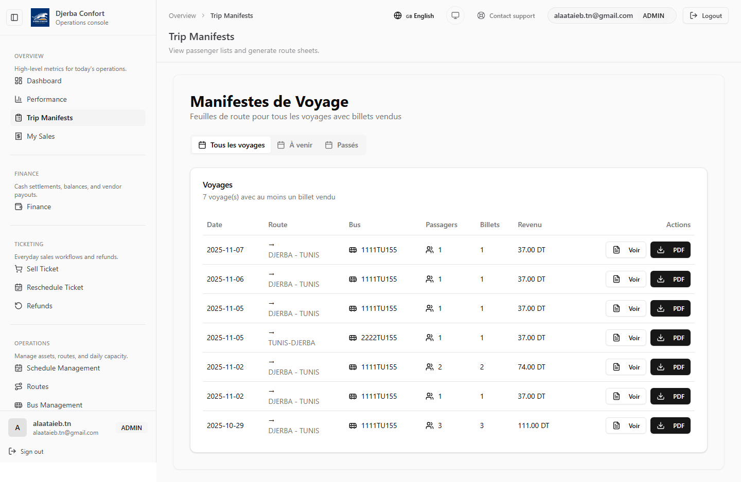 The core problem this system solves is the fragmentation and inefficiency often found in traditional transportation management. By centralizing all aspects of operations, from route planning and schedule creation to real-time ticket booking and refund processing, Djerba Confort provides a unified solution. This allows the company to better manage its fleet, optimize resource allocation, and improve customer service through a seamless booking experience. The target audience includes bus company administrators, station managers, agents, and end-users looking to purchase bus tickets.
