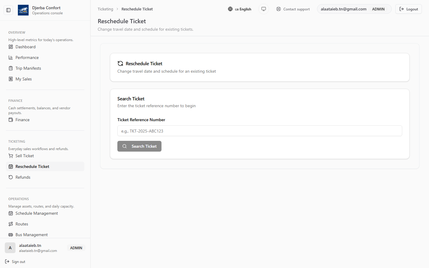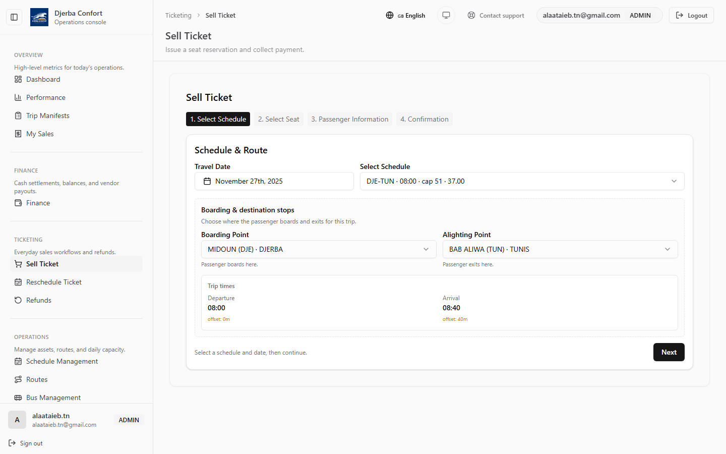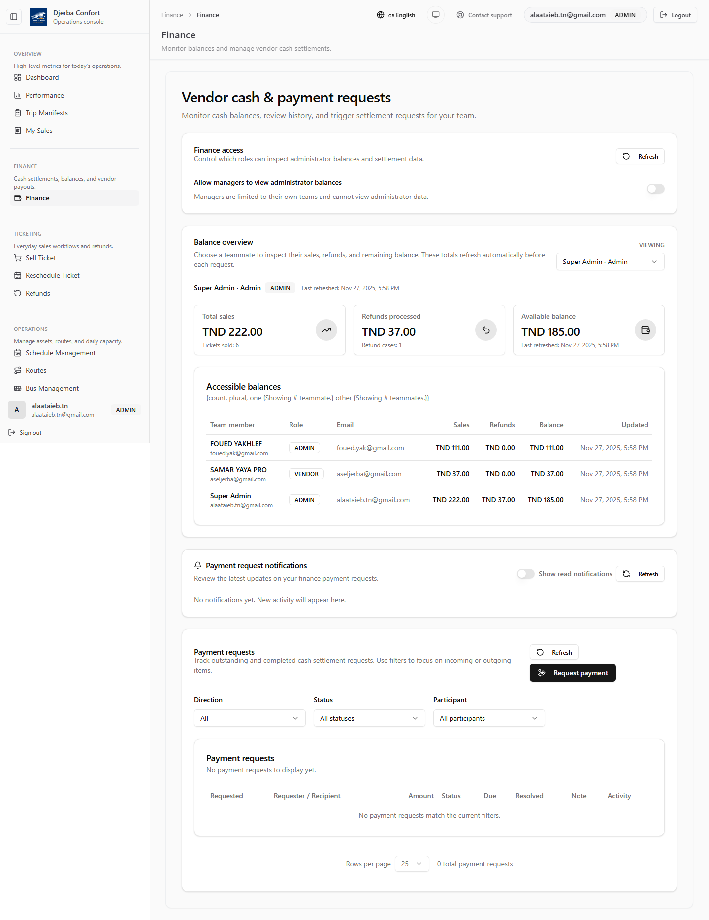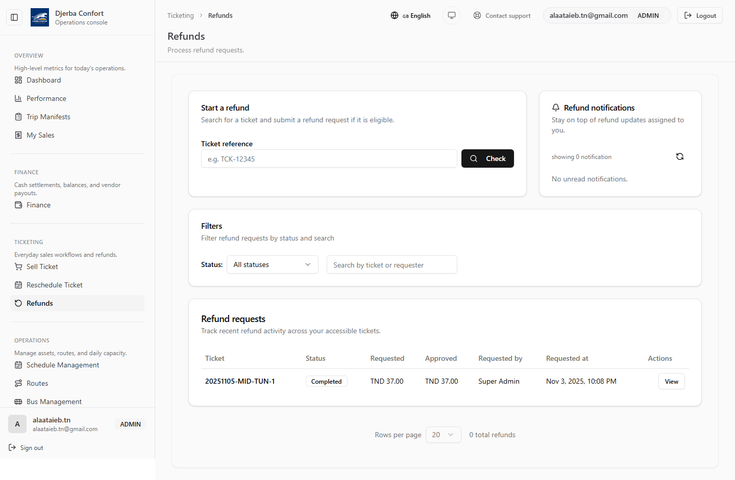 The core problem this system solves is the fragmentation and inefficiency often found in traditional transportation management. By centralizing all aspects of operations, from route planning and schedule creation to real-time ticket booking and refund processing, Djerba Confort provides a unified solution. This allows the company to better manage its fleet, optimize resource allocation, and improve customer service through a seamless booking experience. The target audience includes bus company administrators, station managers, agents, and end-users looking to purchase bus tickets.