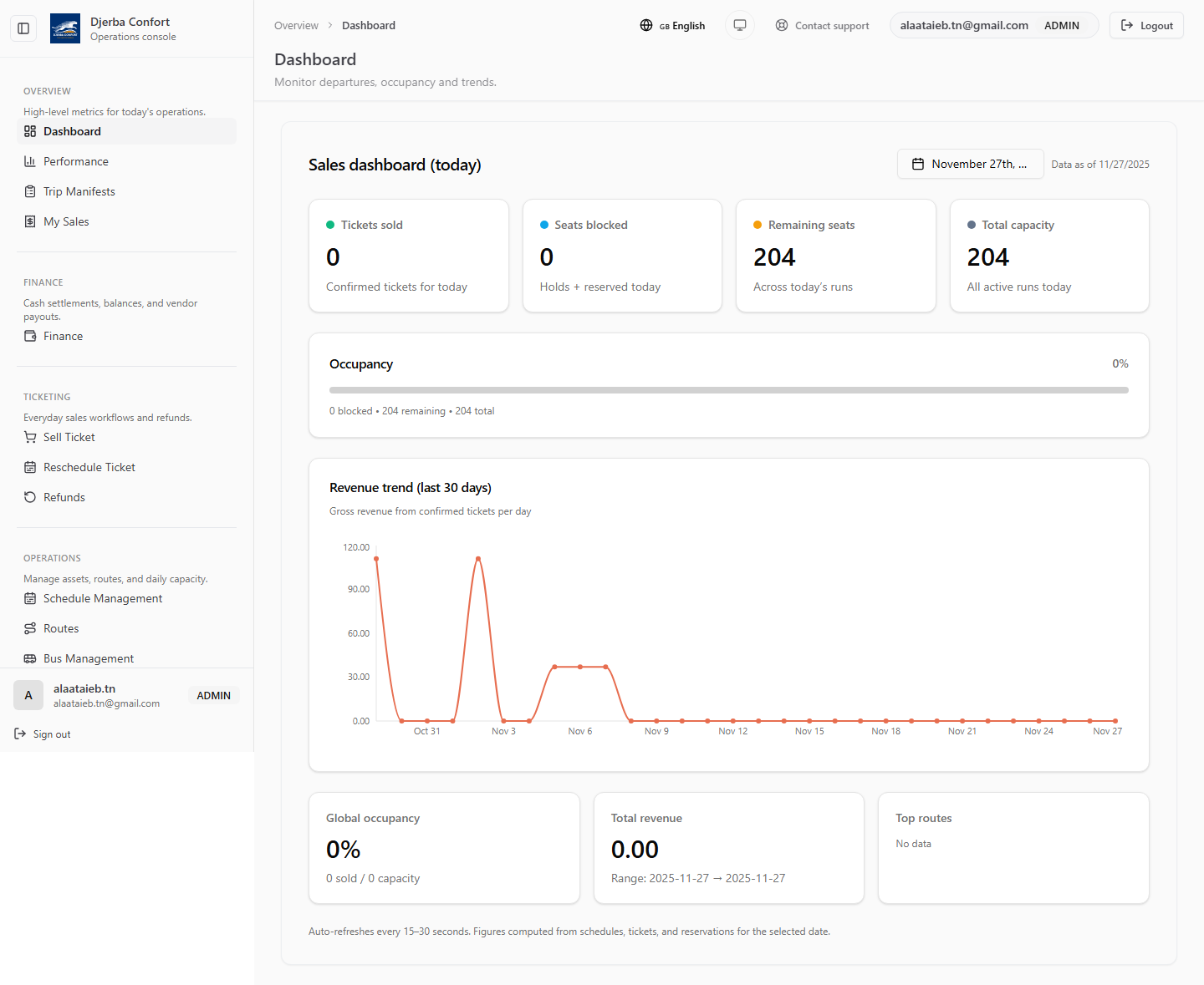 The Djerba Confort Management System is a comprehensive web application designed to streamline and optimize the operations of a bus transportation service. It addresses the complexities of managing routes, schedules, seat inventory, ticket sales, and financial transactions within a single, integrated platform. The system aims to eliminate manual processes, reduce errors, and enhance efficiency for both administrators and customers.