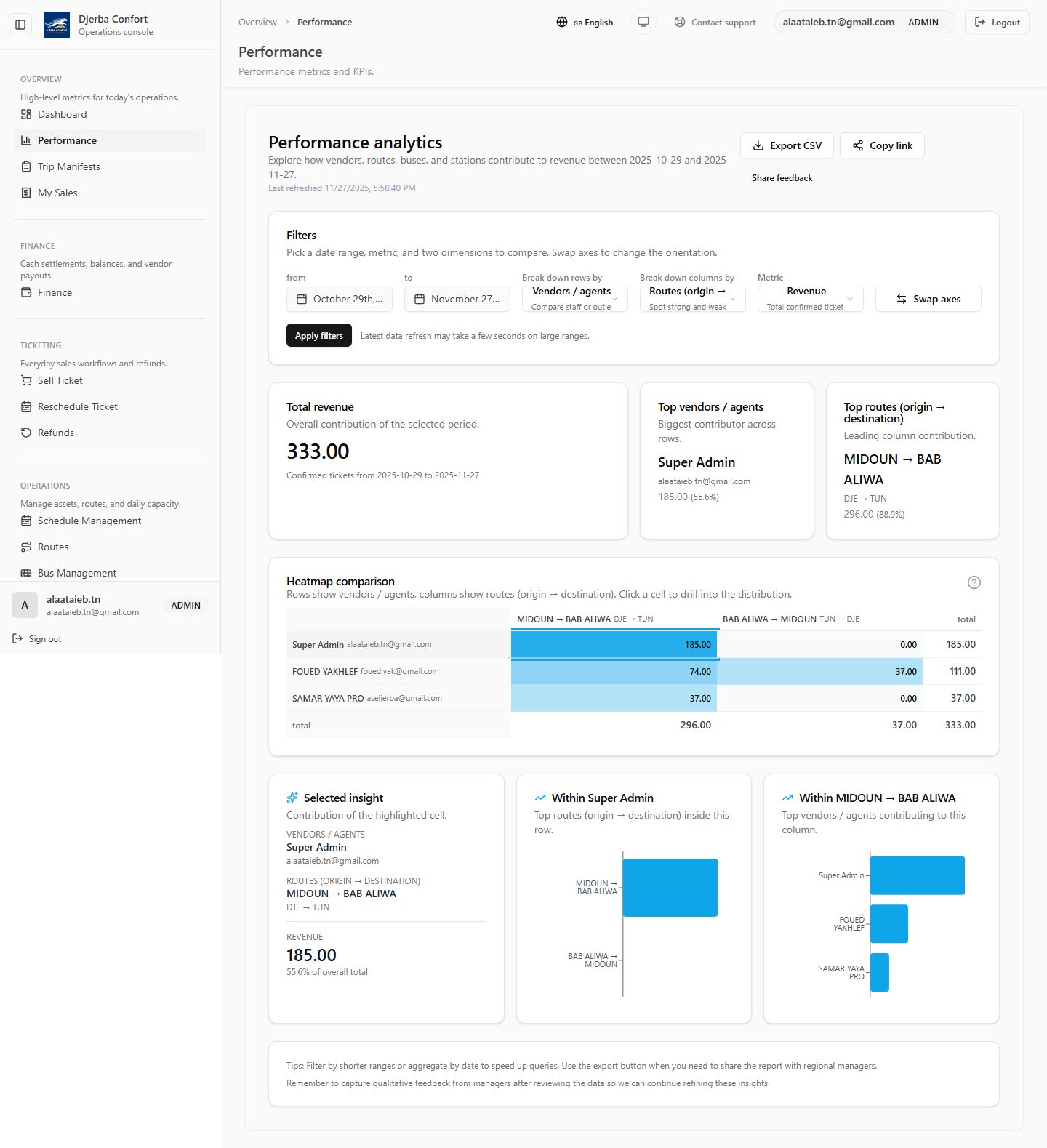 The key value proposition of the Djerba Confort Management System lies in its ability to deliver operational control, financial transparency, and a superior user experience. It empowers administrators with powerful tools for managing all facets of the business, while providing customers with a modern, user-friendly interface for booking and managing their travel. The system's robust features, including dynamic scheduling, real-time inventory, and comprehensive reporting, contribute to increased revenue, reduced operational costs, and enhanced customer satisfaction.
